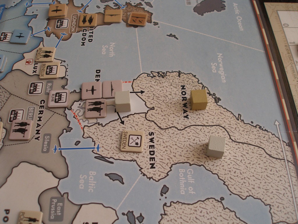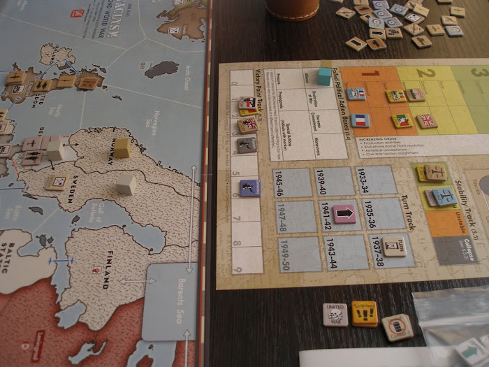 Поскольку мои войска оказались неподалёку от Финляндии, я решил взять под контроль и её. Как показало будущее, это было очень рискованное решение. Дело в том, что в этом сценарии на двоих СССР не участвует в игре, но пассивное влияние на неё оказывает. При попытке захватить любую страну в зоне его интересов игрок получает штрафной красный кубик, за каждый из которых в конце игры он может потерять от 0 до 2 победных очков.